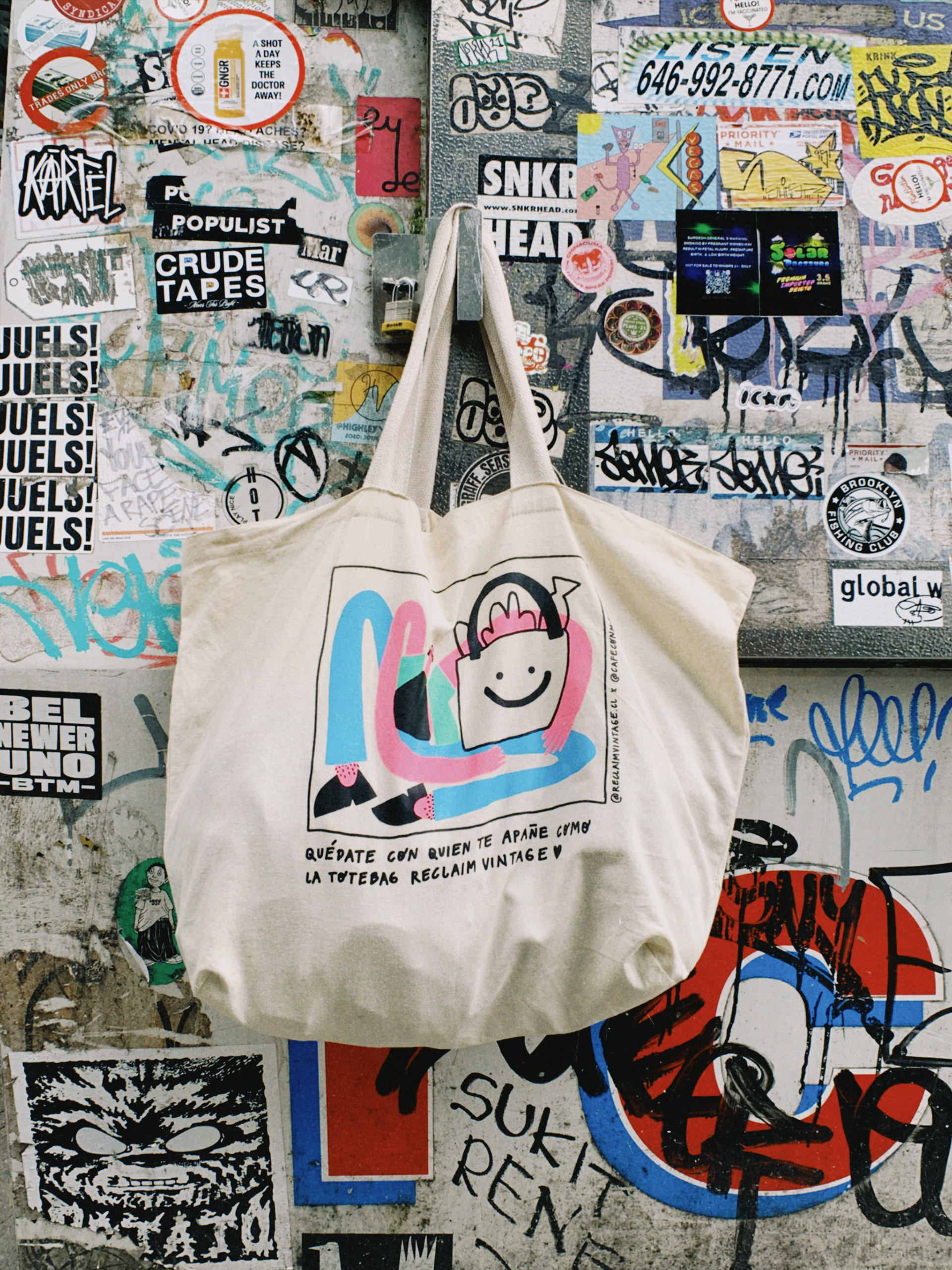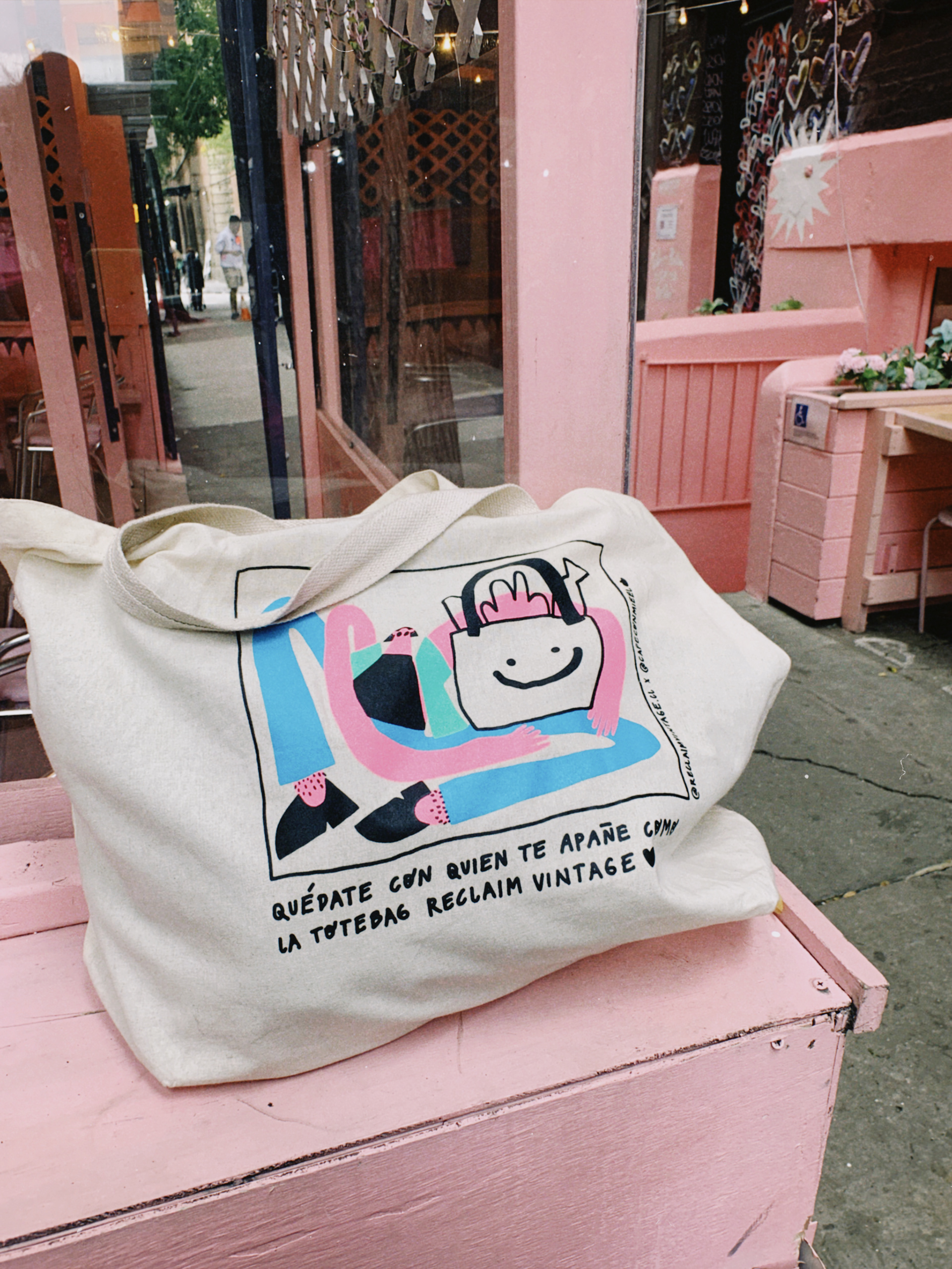 ilustración estampada con técnica de serigrafía sobre totebag para tienda vintage