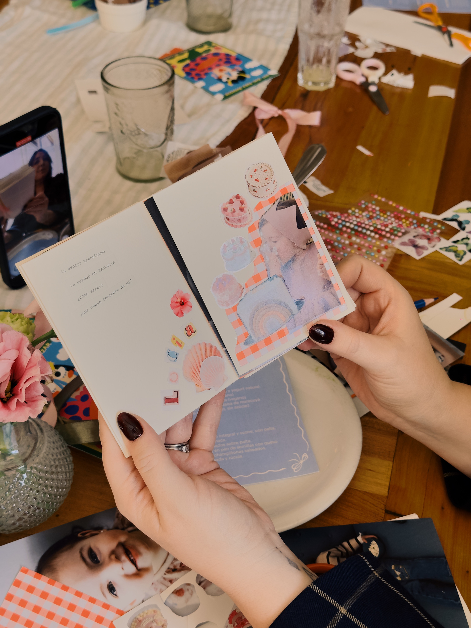 una invitación a conectar con la ternura, la nostalgia y la creatividad. este taller está pensado como un momento creativo para mamás embajadoras de la marca opaline, donde, a partir de un relato escrito por mi, fueron completando cada página del fanzine con imagenes y recortes acordes a cada etapa de la maternidad. cada una transformó este objeto en un espacio para expresar emociones y registrar momentos.